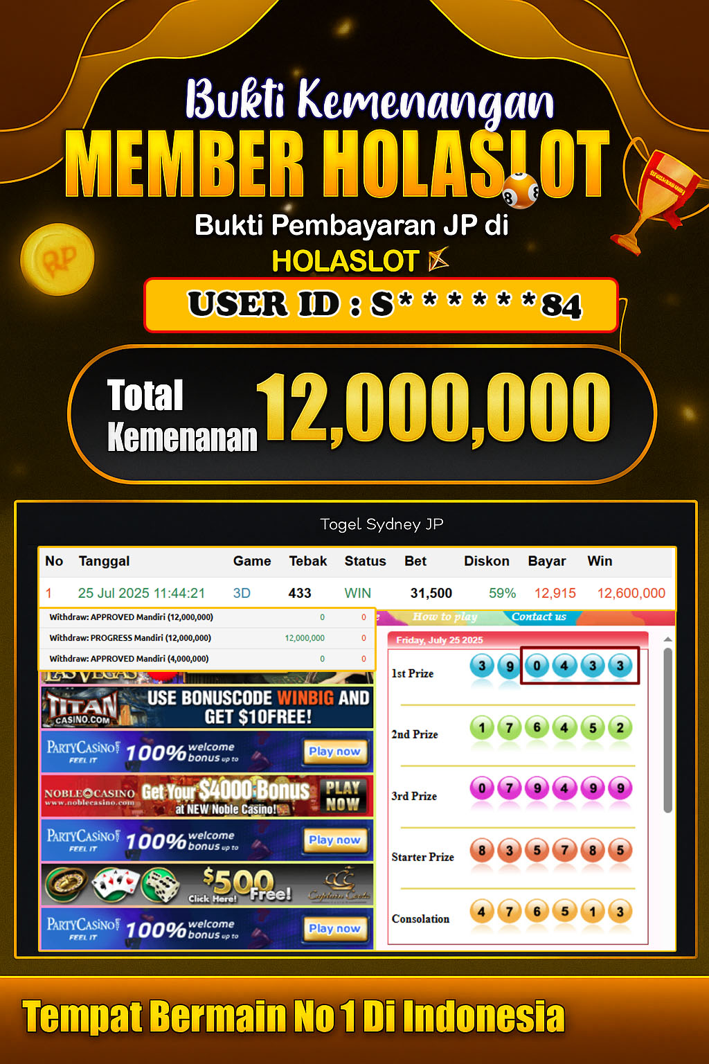 Selamat datang di halaman testimoni kemenangan HOLASLOT, tempat di mana para pemain berbagi kisah nyata tentang keberuntungan mereka! Tidak hanya seru, tetapi setiap putaran di HOLASLOT bisa menjadi awal dari kemenangan besar Anda. Selain itu, beragam bonus dan jackpot fantastis siap menanti Anda setiap harinya. Karena itu, jangan ragu untuk mencoba peruntungan Anda bersama ribuan pemain lainnya yang sudah lebih dulu merasakan sensasi menang. Yuk, mainkan slot favoritmu sekarang dan buktikan sendiri mengapa HOLASLOT menjadi pilihan utama pecinta slot online di Indonesia.